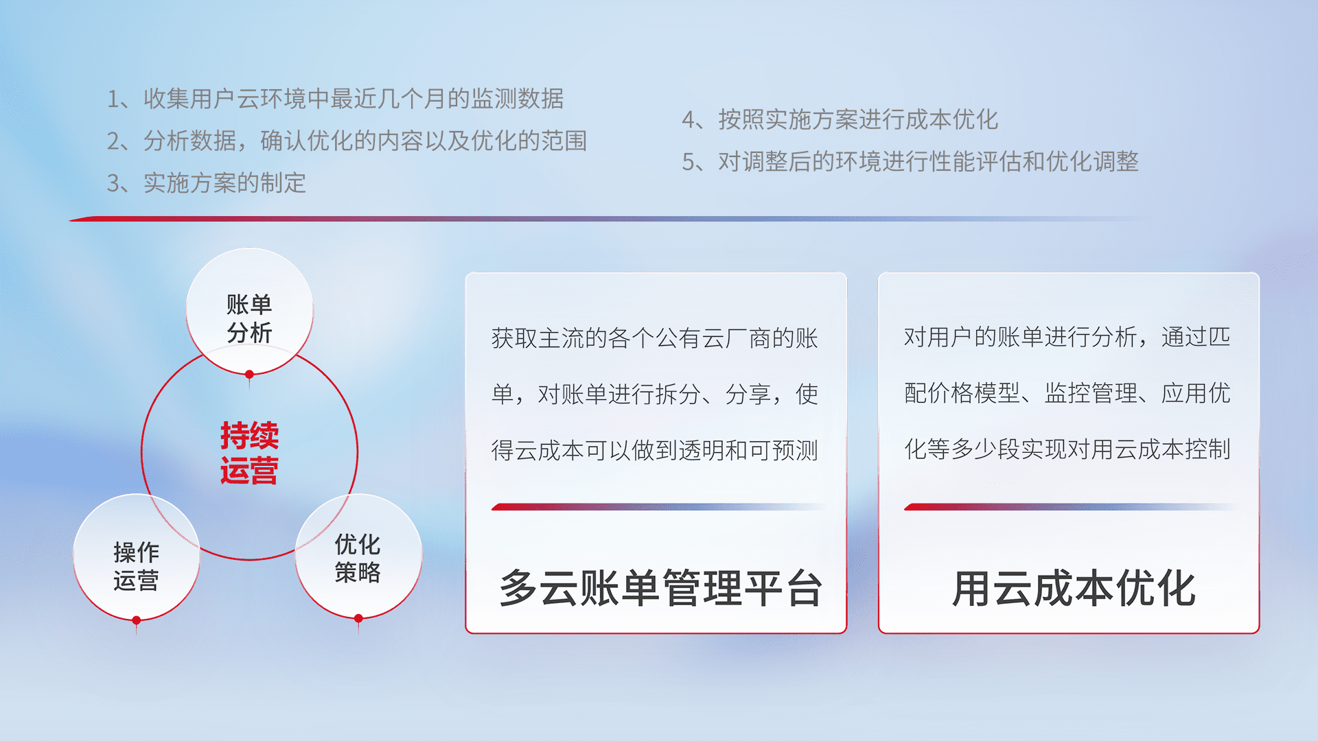 通过多云纳管,,,,以统一的资源数据模型把客户的云资源进行抽象和封装,,,进而实现对多云资源的统一操作,,,保障云资源管理的可靠性、、、稳定性与可用性。。量身定制化运维内容,,,配置、、、开发运维、、补丁管理、、、备份、、监控、、、、认证和访问管理、、审计和日常巡检等,,,,保障在用云过程中的可靠度,,,稳定度以及高可用率。。